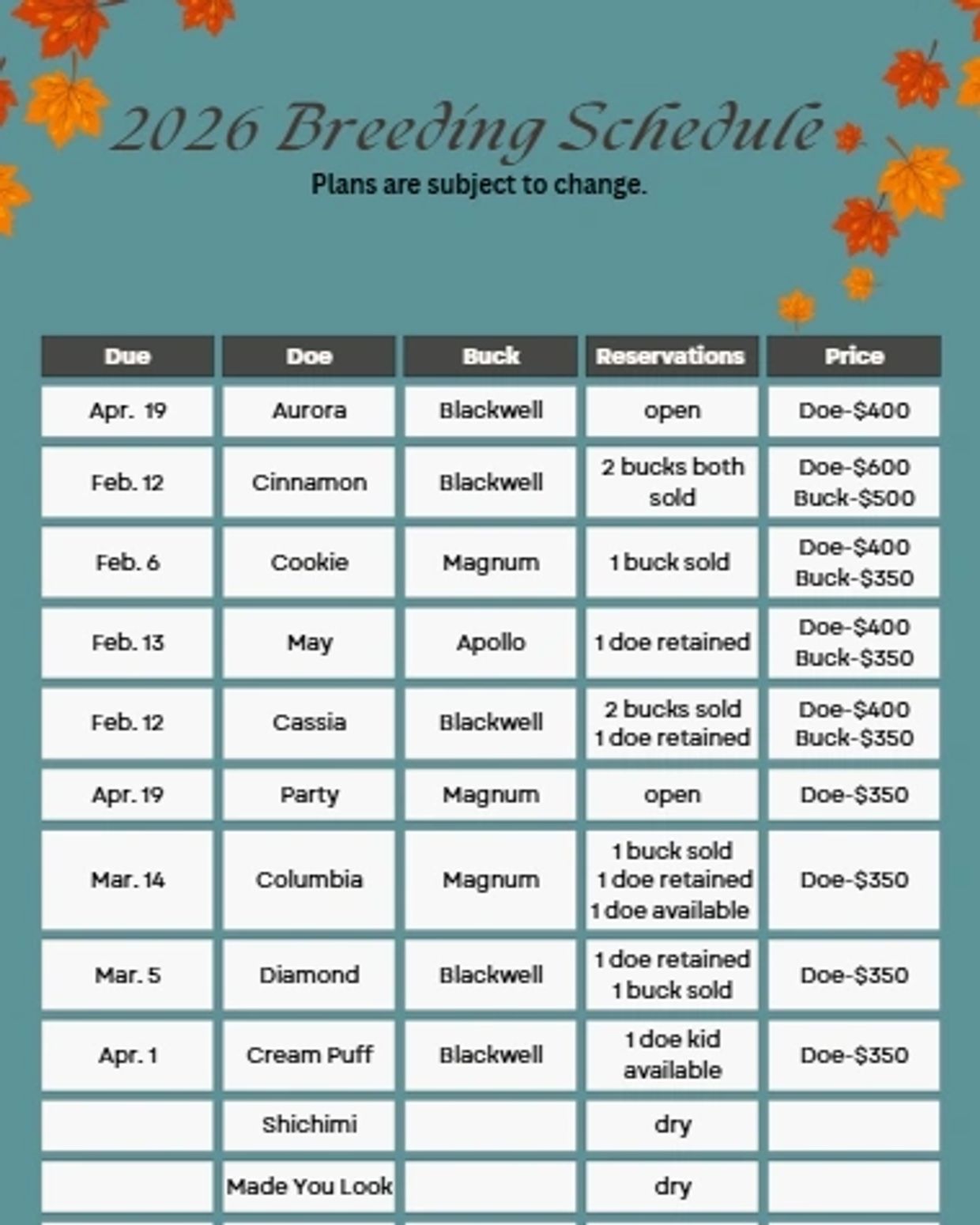 Prices have been determined by how well animals have performed in the show ring and on the milk stand. No registered bucks will be offered out of does with no price listed for buck kids.